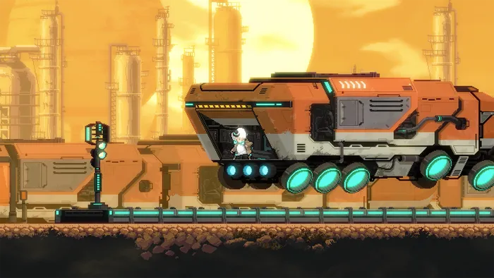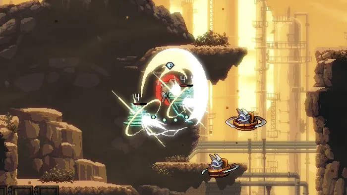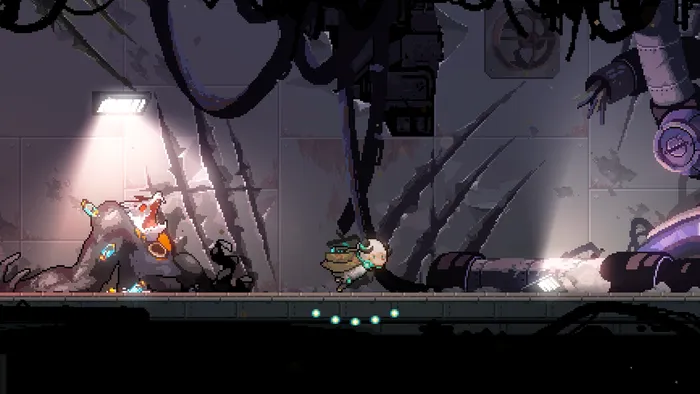 游戏采用高精度像素美术,以鲜明的色彩对比和动态光影,构建出荒芜的机械废墟等极具氛围感的场景。细腻的角色动画、巨剑劈砍时飞溅的像素特效,以及敌人破碎后的“数字残骸”,都让每一次战斗更加激烈而富有冲击力。
