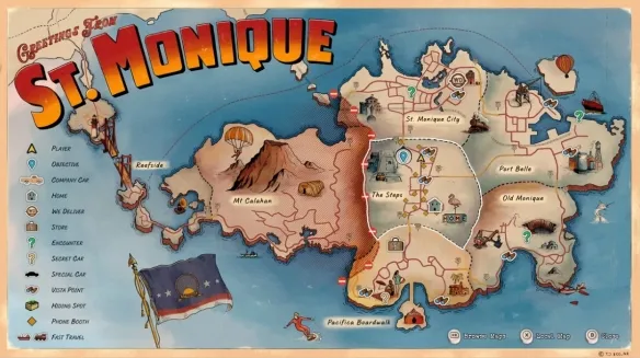 游戏的舞台设定在圣莫尼科岛,这里地貌、人文和产业都非常丰富。玩家在探索时并不是完全开放的世界,而是分为六个区域,移动到边界时会切换到另一张地图。