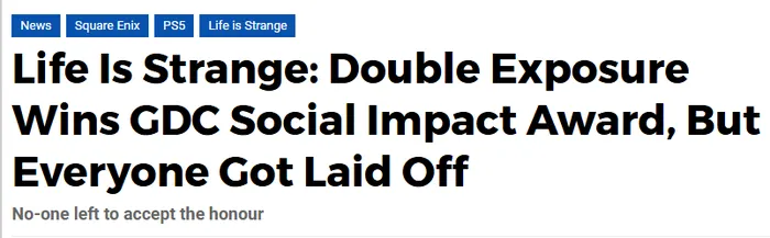《奇异人生:双重曝光》叙事设计师Elizabeth Ballou在Bluesky上分享道:“这款游戏获得了GDCA大奖,但没有人去领奖,这倒挺合适的,因为我们都被解雇了,哈哈。我们当中有不少人在GDC上,但根本不知道我们被提名了,所以没人准备去领奖。”