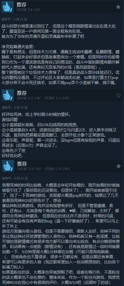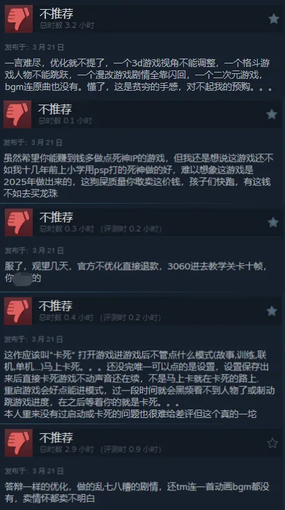 差评主要集中在剧情处理和优化问题上。玩家批评剧情叙述依赖闪回,缺乏连贯性,同时游戏优化不佳,频繁出现卡顿和掉帧现象。不过,也有部分玩家给了好评,认为战斗演出出色,情怀还原到位。