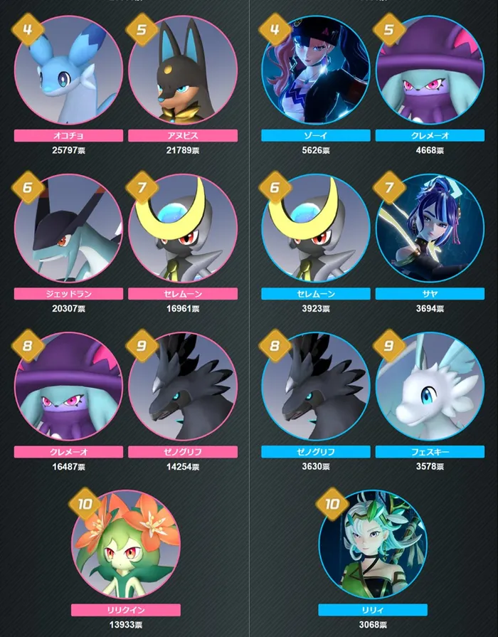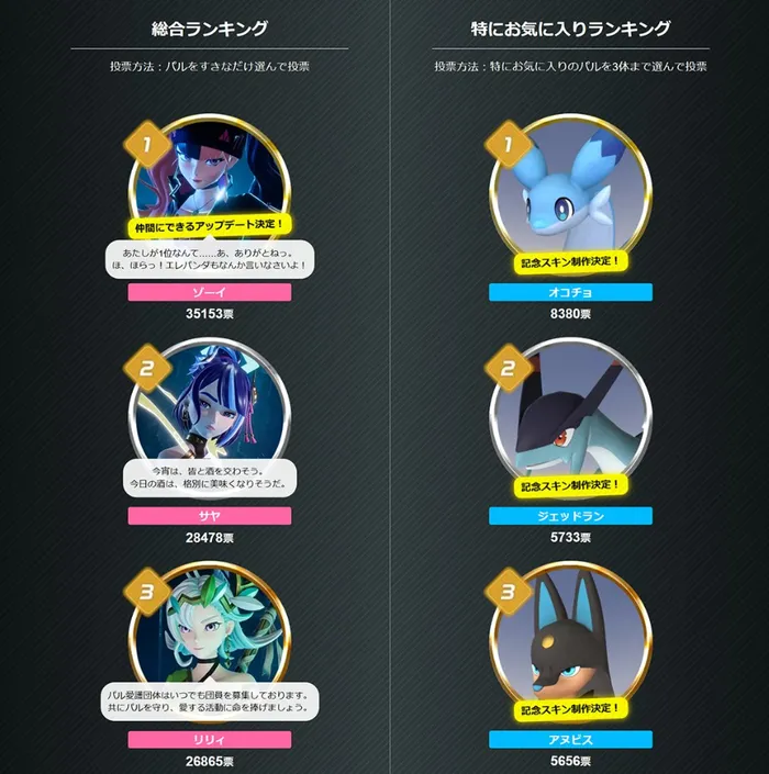Pocketpair今日公布的投票结果显示,综合排行榜前三名均由人类角色夺得。第一名“佐伊”以3.5万票毫无悬念夺冠,开场与辉月伊举杯敬酒的“纱夜”以2.8万票获得亚军,爱帕成痴的“莉莉”以两千票之差紧随其后获得季军。
