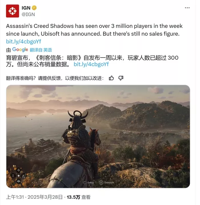 育碧官方宣布,《刺客信条:影》自5月20日发售以来,全球玩家总数已突破300万,累计游玩时长超过4000万小时。该作在发售24小时内玩家数突破100万,48小时内超过200万,但后续增长有所放缓。