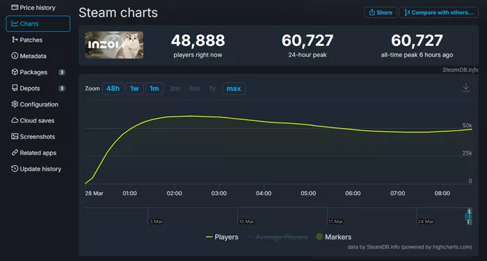 根据SteamDB的数据,游戏在Steam平台的历史在线人数峰值达到了60727人,截稿之前,仍有超过4.8万人在线。考虑到工作日的缘故,这个数字预计到晚上还将迎来一波增长。