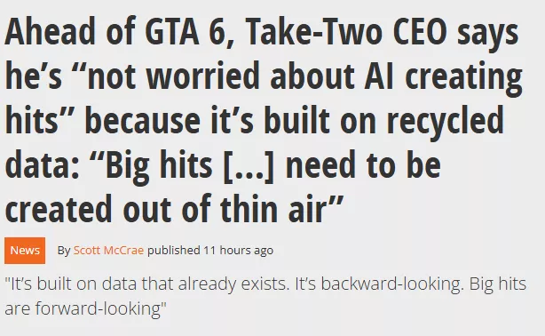 在他看来,生成式AI只能基于现有数据重组内容,缺乏真正的创新力:"AI是回顾过去,而爆款游戏必须面向未来。"这一观点也被视为对《GTA 6》创新方向的暗示。
