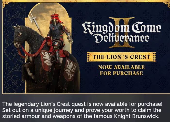 近日,开发商Warhorse Studios宣布《天国:拯救2(Kingdom Come: Deliverance II)》预购奖励DLC已正式上线Steam,该DLC包括“雄狮纹章”额外任务以及相关的盔甲和武器套装。该DLC在国区的售价为18.8元。