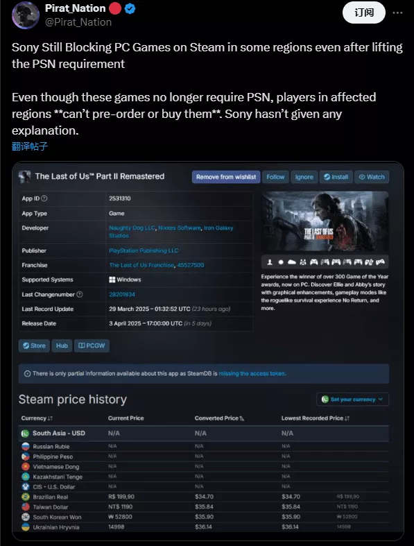 尽管本次移植版未强制要求绑定PSN账号,但索尼仍未说明这些地区限制的具体原因。对此,推主@Pirat_Nation发文吐槽:“即使取消了PSN要求,索尼仍在某些地区屏蔽Steam上的PC游戏,而索尼尚未给出任何解释。”