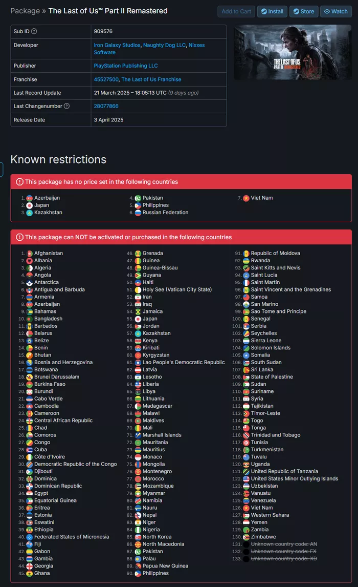 索尼旗下多款PlayStation独占游戏陆续登陆PC平台,《最后生还者2重制版》PC版将于4月4日发售,但SteamDB数据显示该作在100多个国家/地区无法购买。