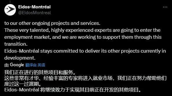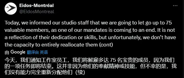 加拿大开发商Eidos蒙特利尔工作室在推特发布声明,宣布解雇75名员工。声明内容如下:“今日,我们已向工作室成员通报,计划最多裁员75位优秀员工。此次裁员是因为我们的一个开发项目即将结束。这绝非对他们工作态度或能力的否定,只是很遗憾,我们无法将他们全部调配到其他正在推进的项目中。这些才华横溢、经验丰富的专业人士即将重新进入就业市场,我们会尽力为他们提供过渡支持。Eidos蒙特利尔仍会全力推进其他正在开发的项目。”