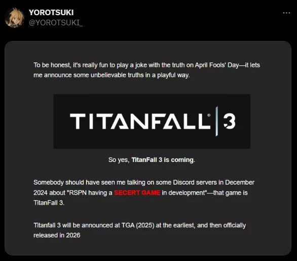 近日,有两位知名《Apex英雄》爆料人透露,Respawn正在开发《泰坦陨落3(Titanfall 3)》,并计划在2025年12月的TGA颁奖典礼上正式公布,预计2026年发售。