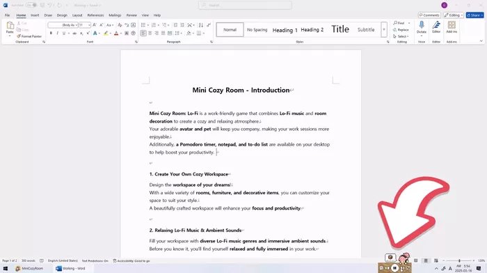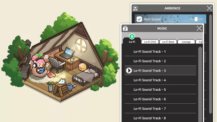 这款融合舒缓Lo-Fi音乐与房间装扮的创意作品,内置多套不同风格的背景音乐库,提供壁炉篝火、机械键盘敲击、雨打屋檐等环境白噪音,支持自由组合音效打造个性化工作氛围。