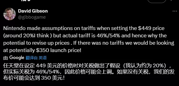 任天堂近日确认Switch 2美国售价为450美元(约合人民币3276元),但分析师指出,若不受近期美国经济政策调整影响,其定价可能仅为350美元(约合人民币2548元)。
