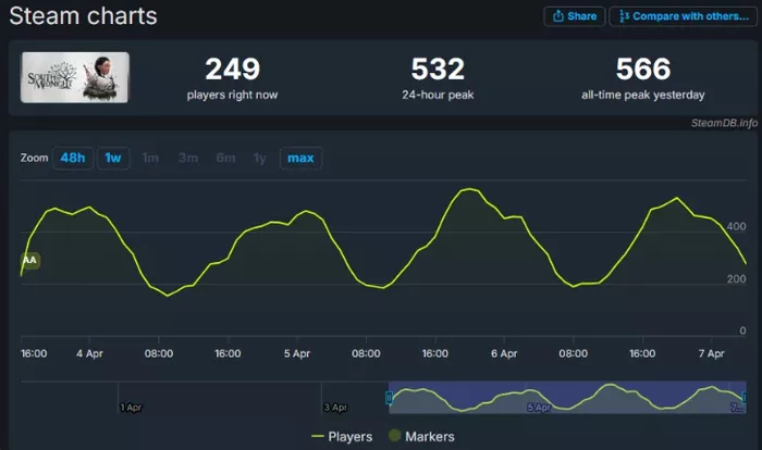 由《少数幸运儿》开发商Compulsion Games打造、微软Xbox游戏工作室发行的重点作品《午夜之南》(South of Midnight),即将于4月8日登陆PC、Xbox Series X/S及Xbox Game Pass平台。尽管购买高级版可提前5天体验游戏,但根据SteamDB数据显示,当前Steam版最高同时在线人数仅566人。