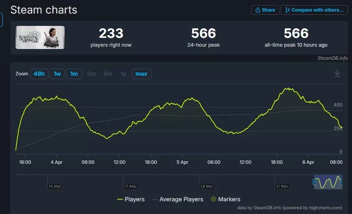 SteamDB数据显示,Xbox第一方游戏《午夜之南》(South of Midnight)典藏版已开放抢先体验,但玩家在线数表现平平。截至4月6日下午14点,当前在线仅233人,24小时峰值566人,历史最高仅566人。