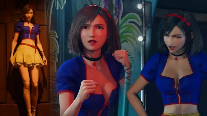 该Mod完美还原了白雪公主标志性的蓝黄裙装与红色发带造型,在保留蒂法原有气质的同时,巧妙融入了童话美学元素,视觉效果非常惊艳。