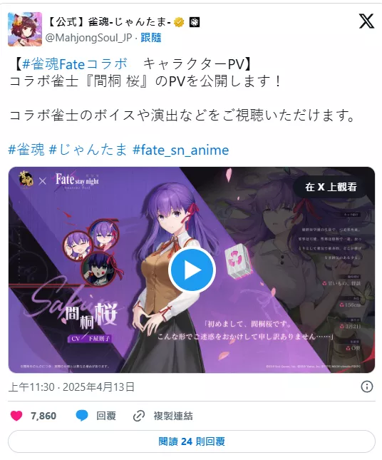 Yostar正式公布了旗下对战型麻将游戏《雀魂麻将 (majsoul)》即将于4月23日启动与《剧场版 Fate/stay night [Heaven’s Feel]》的联动活动,并推出备受期待的联动雀士“间桐樱”(CV:下屋则子)的相关信息。