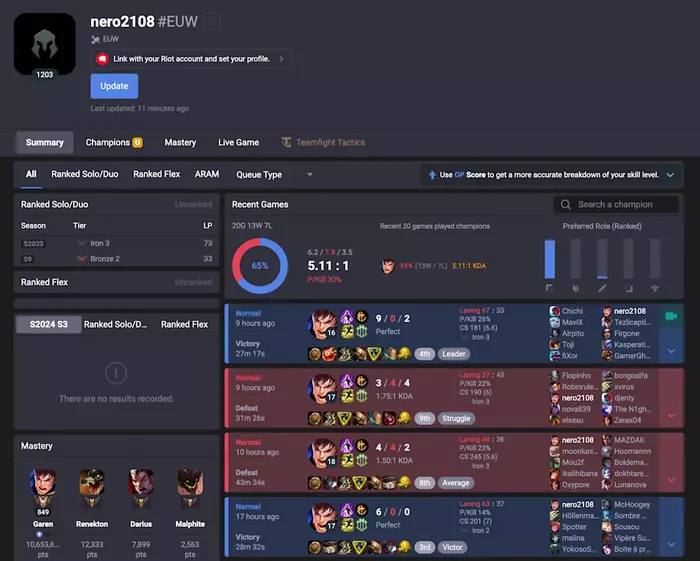 nero2108的数据显示,他至今仍每天使用盖伦。上一次选择其他英雄(好运姐)还是在去年9月,再往前则要追溯到2020年。Wasted on LoL网站统计他的游戏时长为11,070小时,但由于该网站仅从2018年开始记录,实际时长应该更长。